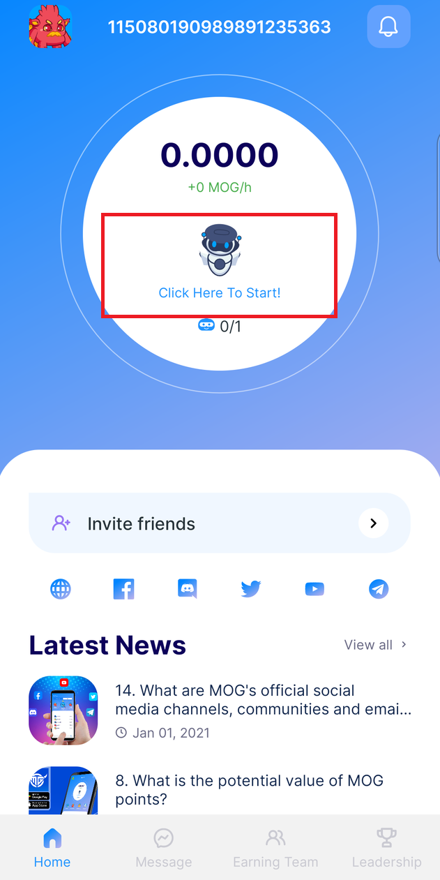 로그인을 하시면 위와 같은 화면이 나옵니다. 파이코인이나 다른 채굴 어플 처럼 클릭 한번만 하시면 되는데 Click Here To Start 있는곳을 눌러줍니다.