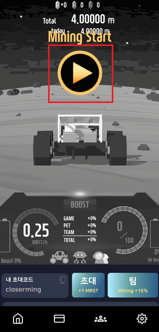 더 마르스 채굴 방법은 파이코인처럼 간단합니다. 어플로 접속하시면 위와 같은 화면이 나오는데 여기서 동영상 플레이 처럼 생긴 버튼만 눌러주시면 됩니다.