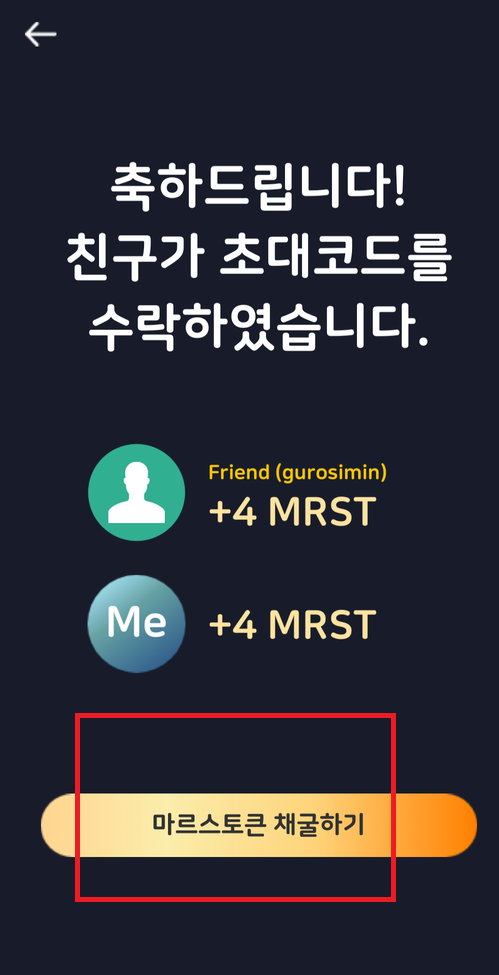 친구가 초대코드를 수락하면 더마르스 가입이 완료됩니다.