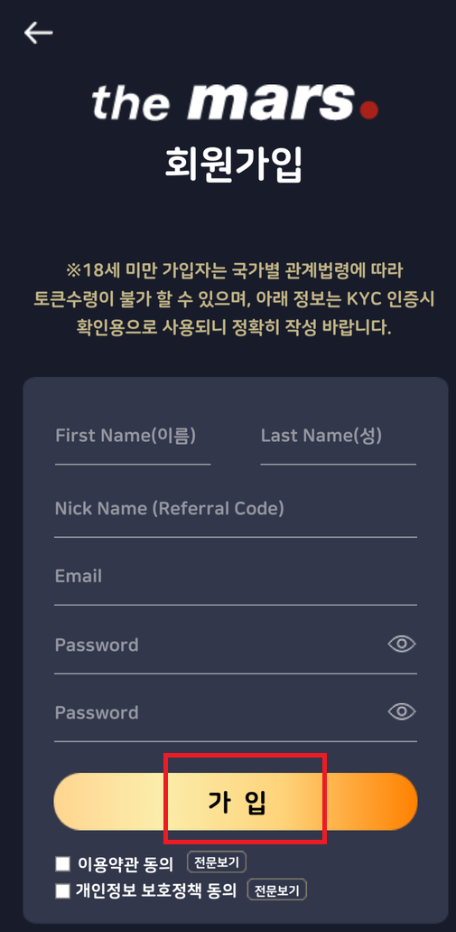더 마르스를 실행하시면 위와 같은 화면이 나옵니다. 여기서 회원가입을 눌러줍니다.
