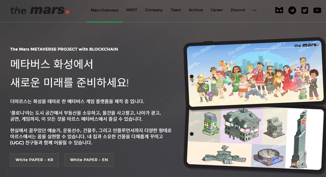 더 마르스는 화성을 테마로 한 메타버스 게임 플랫폼을 제작하고 있는 회사 입니다. 콜로니 라는 도시 공간에서 부동산을 소유하고, 물건도 사고 팔고, 나아가 광고, 공연, 게임까지 더 마르스 메타버스에서 진행 할 수 있습니다. 어플에서 무료로 채굴 하고 있는 것으로 메타버스에서 필요한 유료 아이템을 살 수 있으니 미리미리 채굴 하시길 바랍니다.