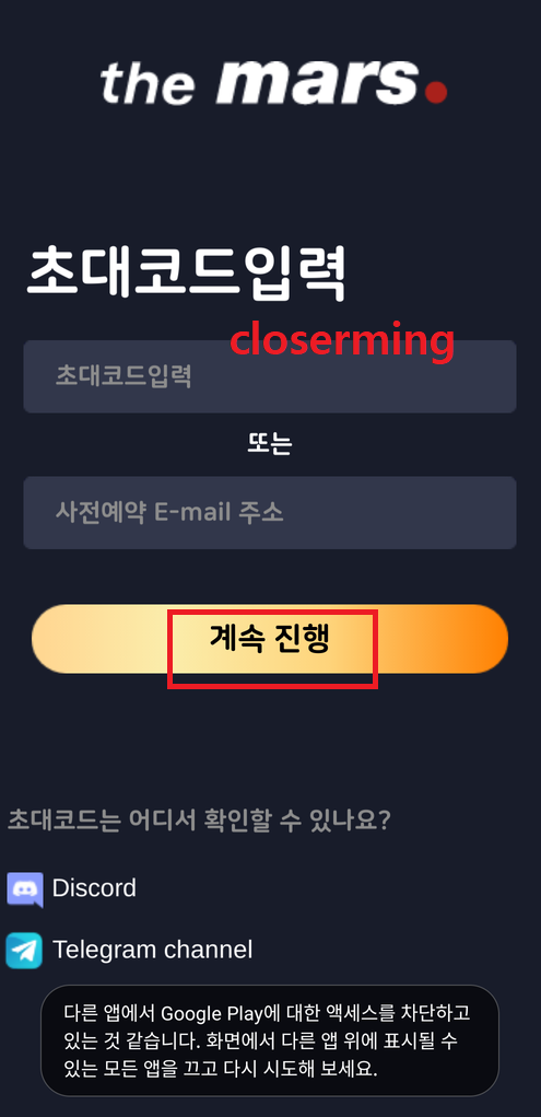 그리고 나서 초대코드를 입력하시거나 사전 예약 이메일 주소를 입력해주셔야되는데 초대코드에 closerming 을 입력해줍니다. 초대코드를 넣어주시면 4마르스를 받으실 수 있습니다!