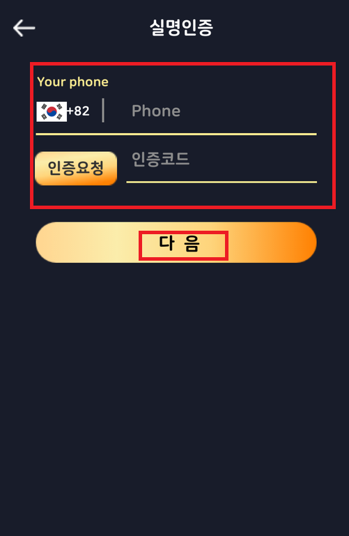다음으로 먼저 실명인증을 하셔야 합니다. 전화번호를 누르고 인증요청을 하신 후 문자로 오는 인증코드를 입력하시면 됩니다. 앞에 +82가 있다고 10 만 넣으시면 안되고 010 부터 시작하는 번호를 입력하셔야 합니다.