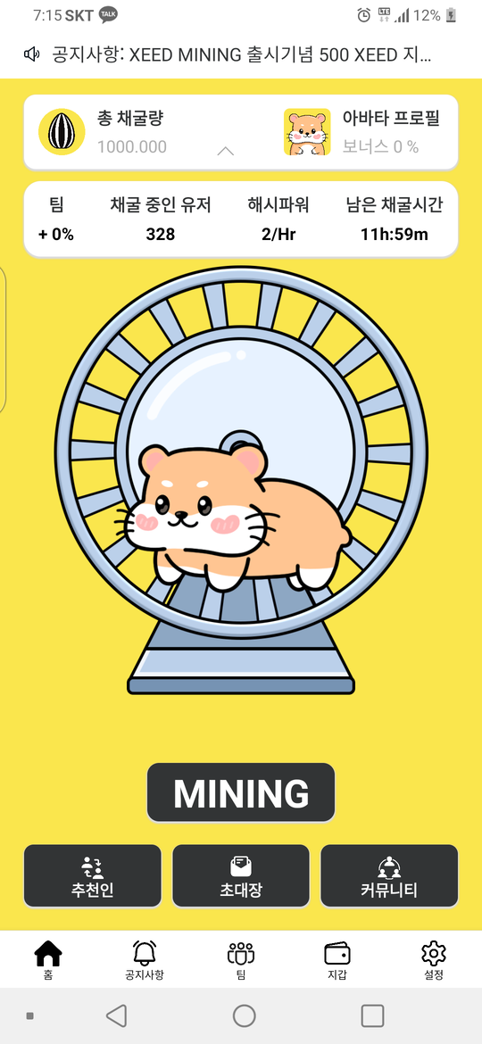 마이닝을 누르면 햄스터가 돌아가면서 채굴을 시작합니다. 팀을 모으시면 채굴 퍼센트가 좀더 올라갑니다~