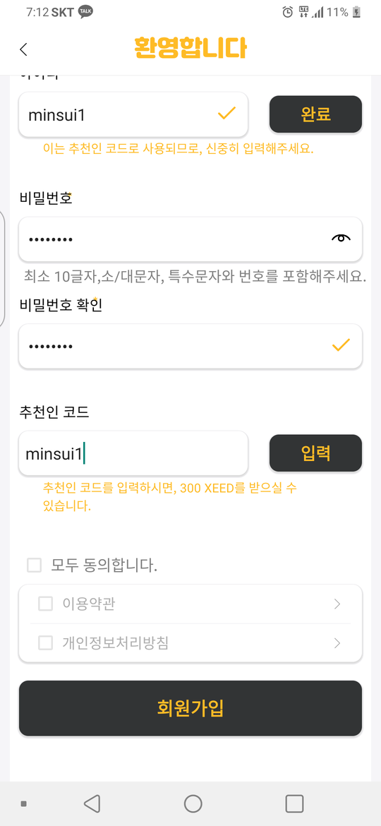 먼저 아이디로 쓰실 이메일을 적어주시고 인증을 눌러주신 다음에 그 이메일로 가셔서 코드를 입력해서 인증을 완료해줍니다. 그리고 아이디와 비밀번호를 적어줍니다. 그리고 추천인 코드에 minsui1 을 적어주시면 300xeed 코인을 더 줍니다.
