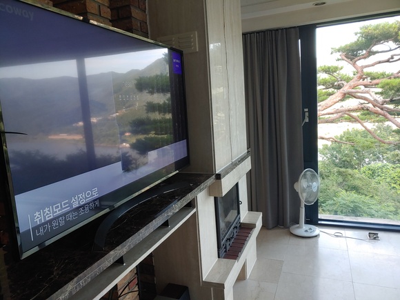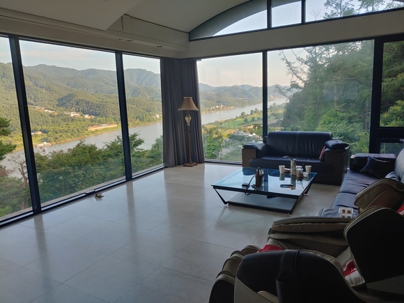 거실 모습입니다~ 통유리로 거실에서 멋진 풍경을 보실 수 있습니다~ 또한 안마의자도 있어서 한번씩 다 해본거 같네요 ㅎㅎ