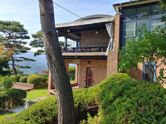 커튼을 열고 본 모습입니다. 펜션 자체가 높게 있어서 내부에서는 지하로 내려가는 곳에 위치하고 있지만 창문을 열면 멋진 풍경을 보실 수 있습니다.