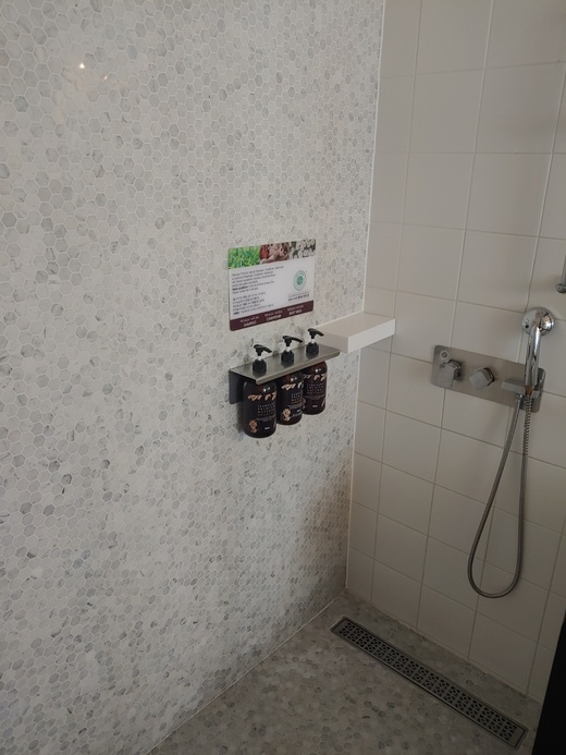 2월호텔 화장실은 샤워시설이랑 욕조, 화장실이 따로 분리되어 있습니다~ 샴푸나, 바디클렌저 등은 1회용품은 안주고 다회용기로 쓸 수 있게 비치되어있습니다.