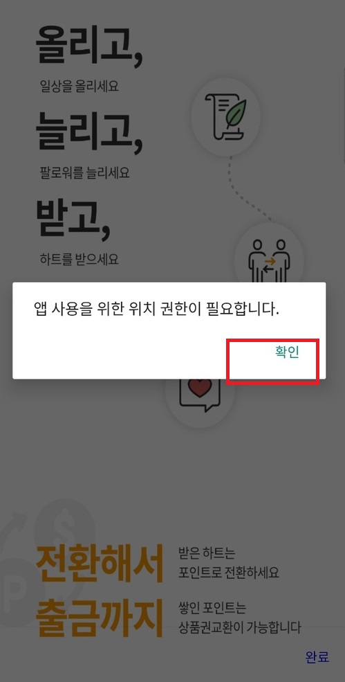 다음으로 앱 사용을 위한 위치 권한이 필요하다는 메세지가 나오면 확인을 눌러줍니다.