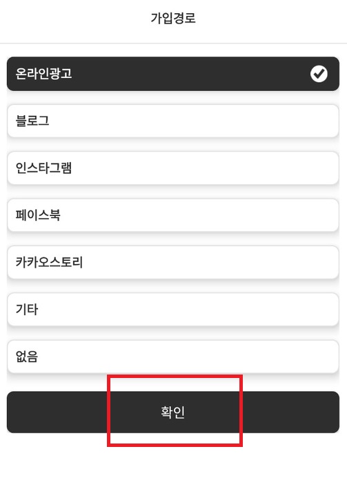 다음으로 가입한 경로에 대해 설문이 나오면 기타나 아무거나 선택하시고 확인을 눌러줍니다.