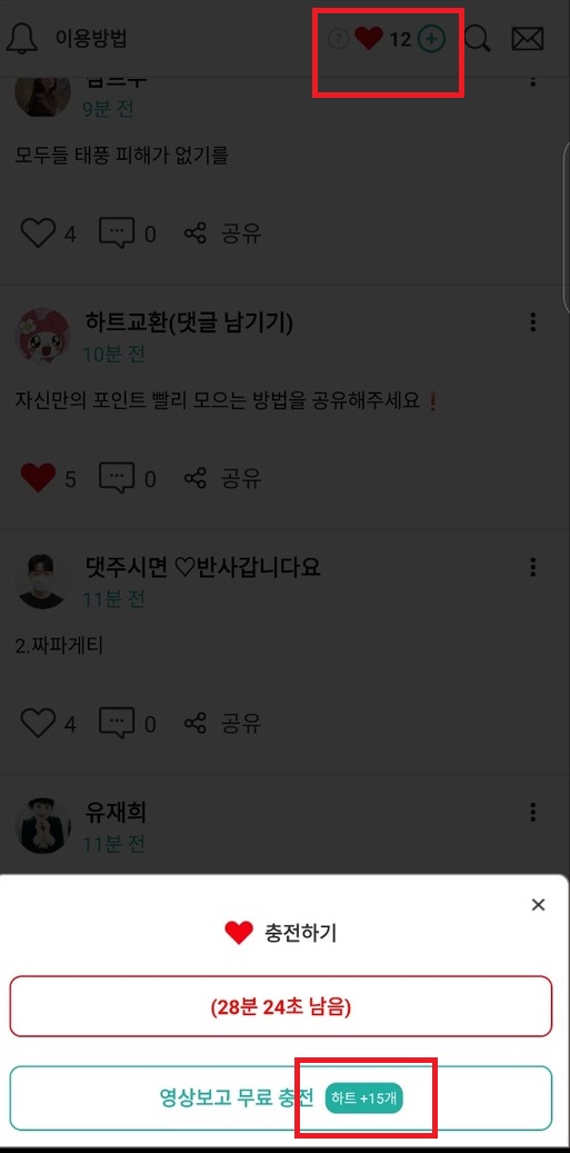 하트는 30분마다 30개씩 무료 충전이 가능합니다. 홈 화면에서 위쪽에 하트 + 표시가 있는데 2가지 버튼이 있습니다. 영상보고 무료 충전을 2번 해주시면 됩니다. 하트를 주는 만큼 포인트를 얻는 것이기 때문에 시간 나실 때 마다 하트를 무료로 모아두시면 됩니다.