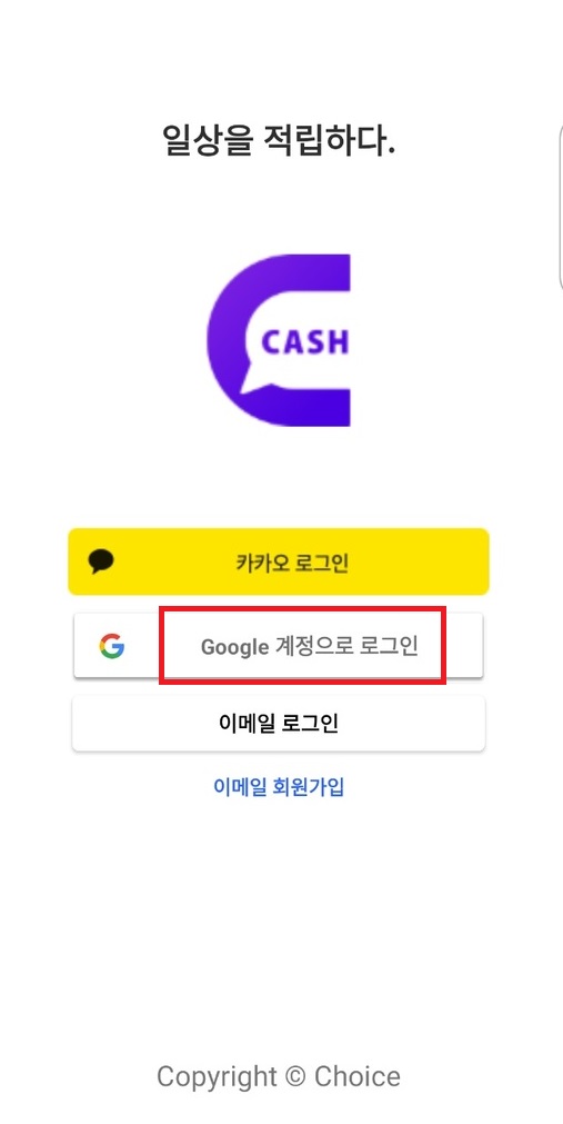 초이쓰캐시를 실행하시면 처음 화면이 보입니다. 여기서 구글 계정으로 로그인을 눌러줍니다.
