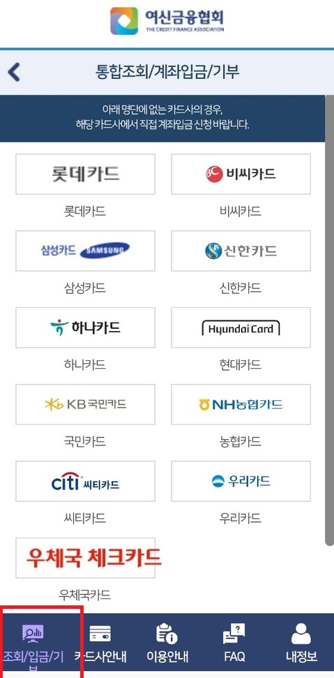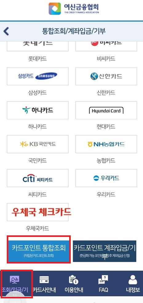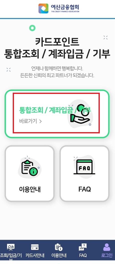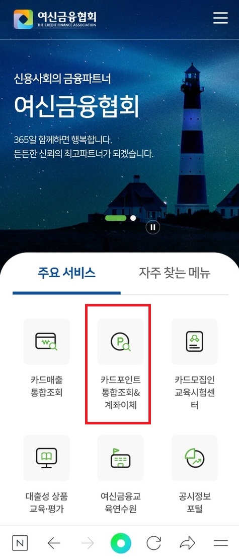 검색창에 여신금융협회 를 검색하시거나 아래 링크로 접속해줍니다. 여신금융협회는 모바일이나 PC에서 모두 접속하실 수 있습니다. 접속하신 후 카드포인트 통합조회 & 계좌이체를 메뉴 클릭해줍니다.