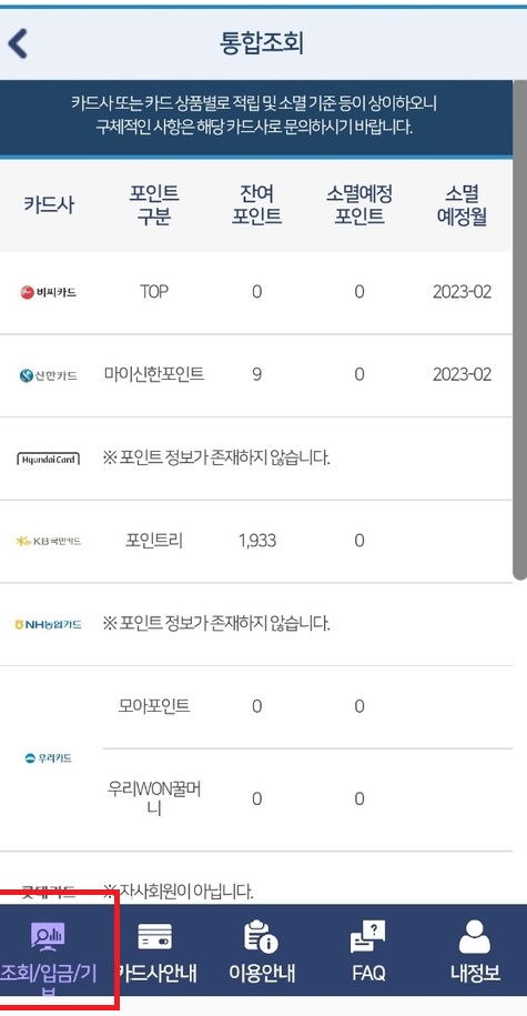 저는 신한카드랑 국민카드 위주로 사용해서 그런지 다른 카드에는 포인트가 없고 국민카드랑 신한카드에 조금 포인트가 있었습니다.
