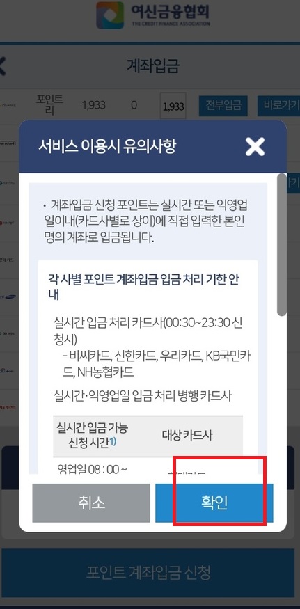 서비스 이용시 유의사항에 대해서 읽어보시고 확인을 눌러줍니다.