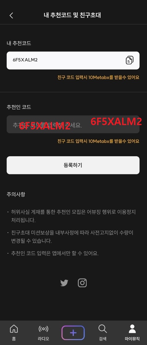 여기서 자신의 추천 코드를 확인하실 수 있고 아래에 추천인 코드를 입력해주시면 10코인을 얻으실 수 있습니다.