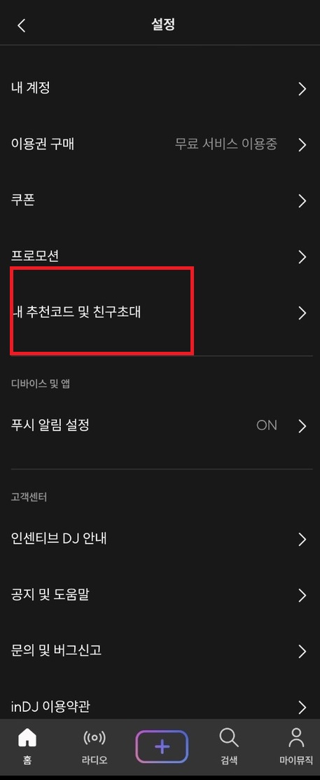 설정 화면에서 내 추천코드 및 친구초대를 눌러줍니다.