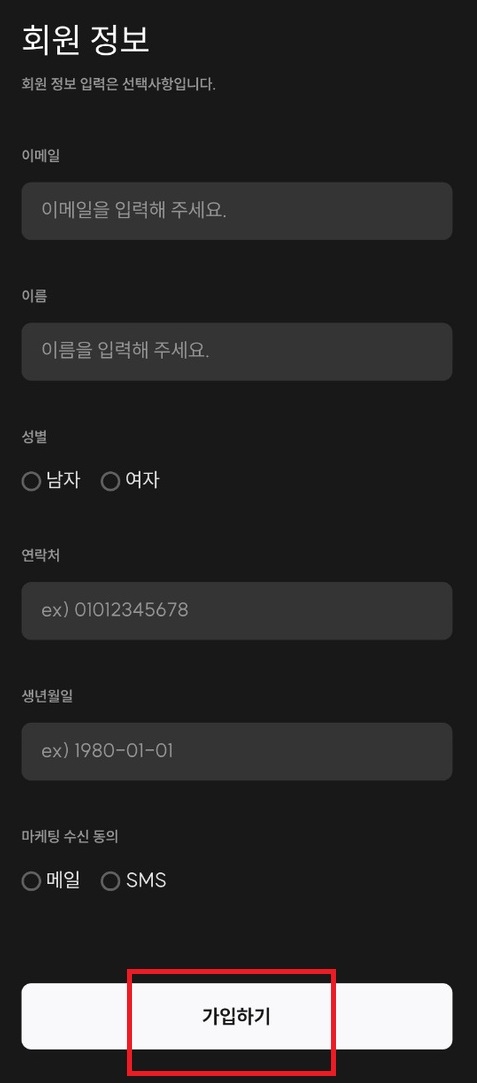 그리고 나서 자신의 회원 정보에 대해 적어주신 후 가입하기를 눌러줍니다. 여기서는 초대코드 입력하는게 안나옵니다.