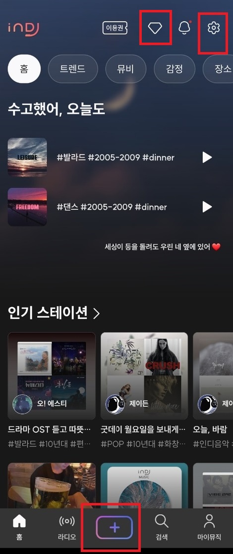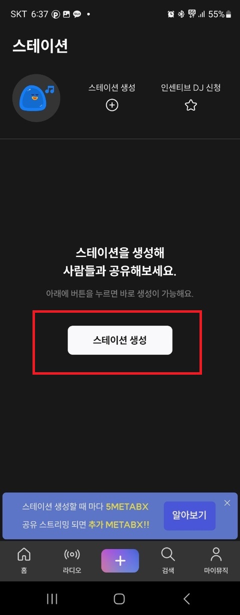 위 화면에서 스테이션 생성을 눌러주시면 됩니다. 스테이션을 생성할 때 마다 5코인을 얻으실 수 있고 인센티브 DJ를 신청하셔서 선정되신다면 사람들이 스트리밍을 들을 때 마다 추가 코인을 얻으실 수 있습니다~