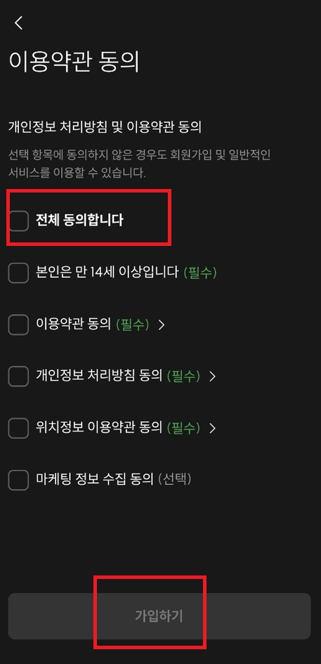 다음으로 이용약관에 대해 동의를 눌러주시고 가입하기를 눌러줍니다.