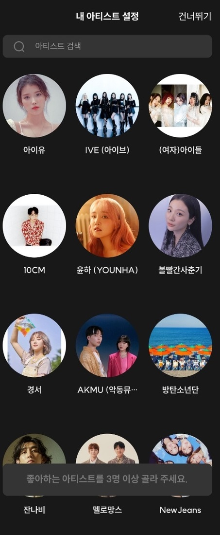 좋아하시는 아티스트를 3명이상 골라주시거나 아니면 그냥 건너뛰기를 하셔도 됩니다~