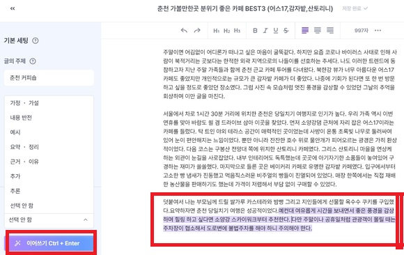 내용을 읽어보시고 뭔가 좀 부족하다 하시면 그 다음 문장에서 글을 좀더 이어쓰실 수 있습니다. 어떤 문장 다음에 이어쓰기 위에 추가하실 내용에 대한 것을 선택해주신 후 이어쓰기를 눌러줍니다. 저는 마지막 문단 다음으로 이어쓰기를 좀더 해보겠습니다.