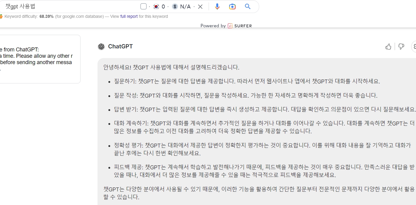 이 확장 프로그램도 첫번째 확장 프로그램과 같이 검색하시면 오른쪽에 chat gpt 검색결과가 같이 나옵니다. 하지만 차이점이 이 프로그램은 구글에서만 나오고 다른 검색 포털에서는 나오지 않습니다.