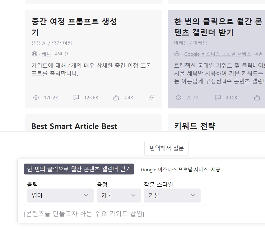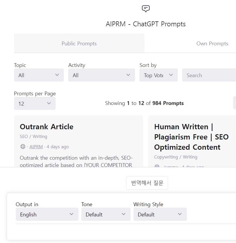 AIPRM 확장 프로그램을 설치 하신 후 CHAT GPT 로 접속해보시면 이렇게 화면이 바뀐 것을 확인하실 수 있습니다. 영어로 되있어서 무슨 뜻인지 아시는 분들은 그냥 템플릿을 사용하시면 되고 영어를 잘 모르시는 분들은 오른쪽 클릭하고 한국어로 번역을 눌러줘서 각 메뉴들이 무슨 메뉴인지 확인해봅니다.