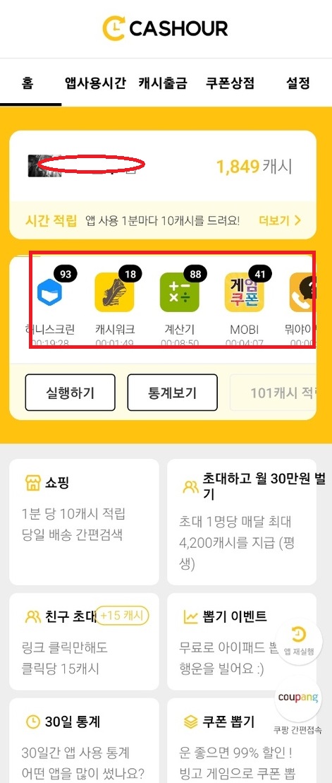 캐시아워에 가입하고 접속하시면 위와 같은 화면이 나옵니다. 여기서 빨간 네모칸 있는 곳에 보시면 사용한 앱들과 그 위에 숫자가 나오는데 어플을 그냥 사용만 하시면 위에 숫자가 올라갑니다. 캐시 적립 방법은 핸드폰에 설치되어 있는 앱을 사용하시면 1분에 10캐시씩 쌓이는데 여기서 숫자가 생긴 어플을 클릭하시면 캐시가 적립됩니다.
