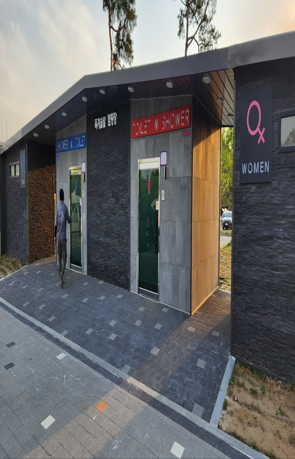 목계솔밭캠핑장 화장실 모습입니다. 남자와 여자 화장실이 있고 옆에는 각각 샤워장이 있습니다.