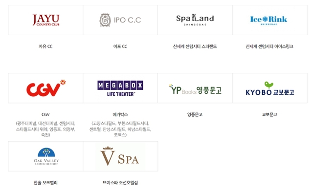 자유cc, 이포cc, 신세계 센텀시티 스파랜드, 신세계 센텀시티 아이스링크, CGV(광주터미널, 대전터미널, 센텀시티, 스타필드시티 위례, 영등포, 의정부, 죽전), 메가박스(고양스타필드, 부천스타필드시티, 센트럴, 안성스타필드, 하남스타필드, 코엑스), 영풍문고, 교보문고, 한솔 오크밸리, 브이스파 조선호텔점