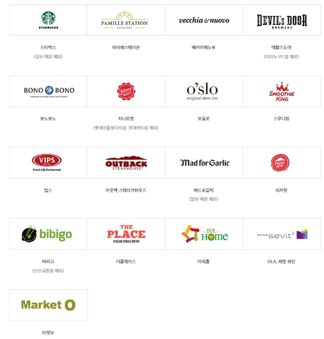 스타필드(일부 매장 제외), 파미에스테이션, 베키아에누보, 데블스토어(여의도IFC매장 제외), 보노보노, 자니로켓(롯데아울렛구리점, 현대카드점 제외), 오슬로, 스무디킹, 빕스, 아웃백 스테이크하우스, 메드포갈릭(일부 매장 제외), 피자헛, 비비고(인천공항점 제외) 더플레이스, 아워홈, OLA, 채빛 퀴진, 마켓오