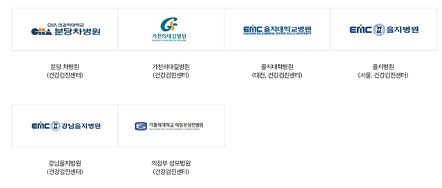 분당 차병원(건강검진센터), 가천의대길병원(건강검진센터), 을지대학병원(대전, 건강검진센터), 을지병원(서울, 건강검진센터), 강남을지병원(건강검진센터), 의정부 성모병원(건강검진센터)