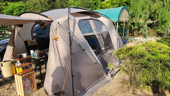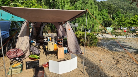 옆에서 본 텐트 모습입니다. 저희가 자리잡은 사이트가 왠지 다른 곳들보다 조금 작은듯한 느낌이 있었습니다.. 차량 옆에 텐트를 치고도 옆으로 왔다갔다 할 수 있는 공간이 좀 좁더라구요..