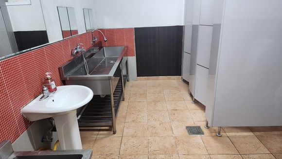 가운대가 개수대이고 양 옆으로 남자화장실, 여자화장실, 샤워실이 있습니다.