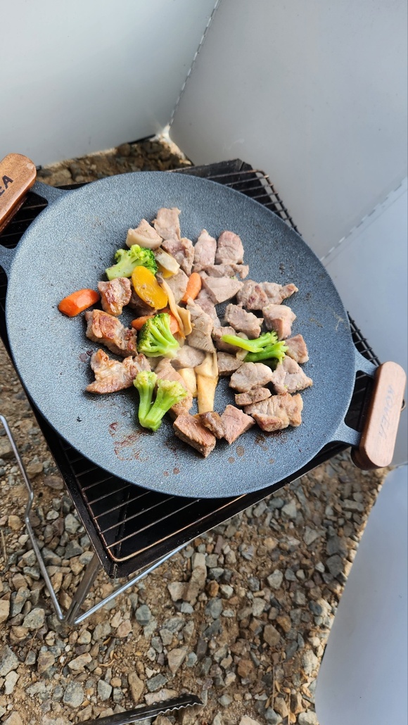 야채와 같이 구워지는 고기들~ 역시 캠핑와서 먹는 고기가 맛있습니다~
