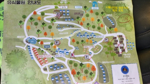 유의사항 뒷면에는 유식물원 안내도가 있습니다. 유식물원은 부지가 엄청나게 넓더라구요~ 여기저기 사이트가 있는데 보통 하늘정원, 하늘 사이트 쪽이 전망이 좋고 단독 사이트 느낌이라서 많이 하시는거 같습니다.