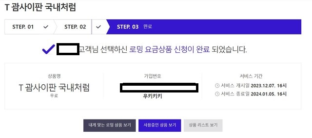 이렇게만 하시면 간단하게 T 괌사이판 국내처럼 로밍 서비스 신청이 완료되었습니다. 신청을 완료하시면 핸드폰 문자로 서비스 가입 문자가 오는데 한번 확인해보시길 바랍니다. 그리고 개시일 전에는 언제든 변경이 가능하니 만약 출국 날짜를 잘못 적으셨으면 다시 수정하시면 됩니다.