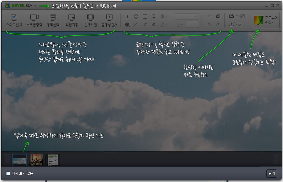 설치가 끝나면 자동으로 네이버 캡처에 대해 간단한 설명이 나오고 캡처 프로그램이 자동으로 실행 됩니다.