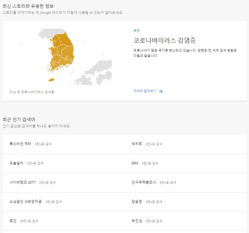 구글 트렌드에서 볼 수 있는 메뉴로는 최신 정보에 대해 알려주는 기능과 최근 인기 검색어에 대해 알려주는 메뉴가 있습니다. 2020년 최신 스토리와 유용한 정보로는 코로나 바이러스 감염증이 나오네요~ 아무래도 2020년 초반에 중국을 시작으로 퍼진 코로나 바이러스가 아직까지 잡힐 기미를 보이지 않기 때문에 코로나 바이러스 감염증이 검색 트렌드에 위치하고 있는거 같습니다. 그 밖에 최근 인기 검색어로는 폭스바겐 제타와 BTS의 소속사인 빅히트, 인구주택총조사 등이 있네요. 마케팅을 전문으로 공부하거나 아니면 일반 사람들도 구글 트렌드를 통해서 사람들의 관심이 어떤게 있는지 알아볼 수 있는 좋은 웹사이트 입니다. ㅎㅎ