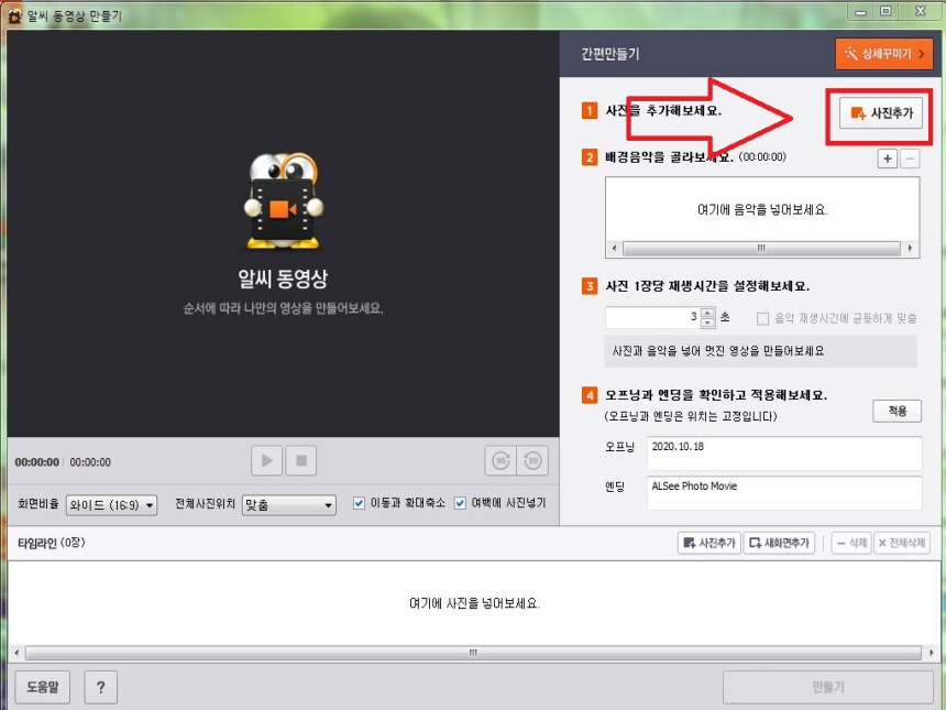 알씨 동영상 만들기 프로그램을 실행하면 처음 나오는 화면 입니다. 만들고 싶은 사진을 사진 추가를 눌러서 여러장 열어줍니다.