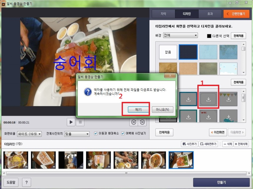 두번째로 디자인 메뉴를 누르면 배경과 액자를 설정 할 수 있습니다. 처음에 다운로드 표시가 있는데 그걸 눌러줘서 다운로드를 해줍니다.