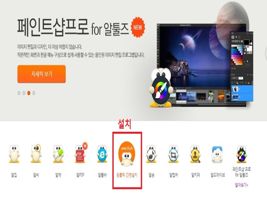 알씨 동영상 만들기는 여러가지 알툴즈 프로그램 중 하나인데 알씨를 다운 받으면 자동으로 설치 됩니다. 알집, 알씨, 등 여러가지 프로그램이 있는데 알씨를 하나 선택해도 되고 아니면 원클릭 간편설치를 눌러서 설치하셔도 됩니다.