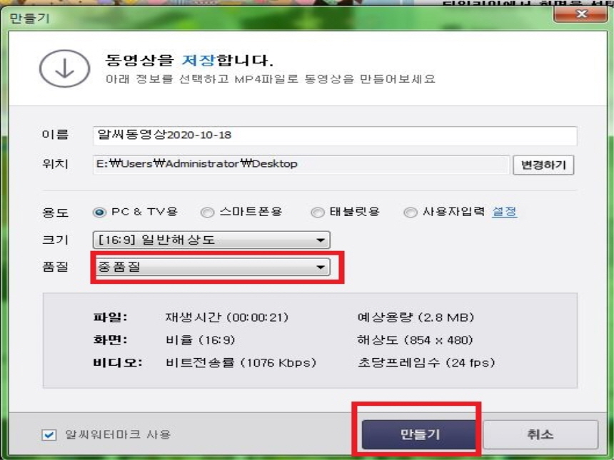 만들기를 누르면 위와같은 화면이 나오는데 크기와 품질을 선택 하고 만들기를 눌러줍니다.