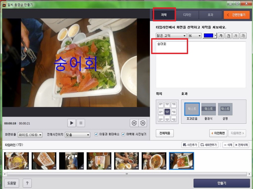 자막을 넣기 위해서 간편 만들기에 자막 메뉴를 선택 하고 자막넣기를 원하는 화면을 선택하고 흰색 창에다가 자막을 넣어줍니다. 흰색 바탕 아래에 위치 메뉴와 효과 메뉴를 이용하면 자막의 위치와 효과도 선택 할 수 있습니다.