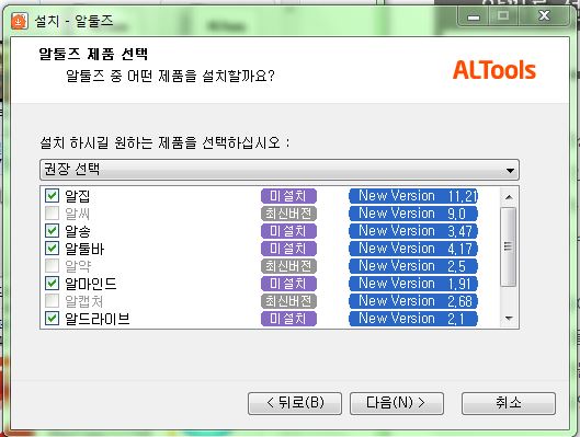 세번째 설치화면 입니다. 여러가지 프로그램들이 나오는데 여기서 전체 선택해서 설치를 해도되고 알씨를 선택해서 설치를 해도 됩니다. 저는 알씨가 설치되어 있어서 최신버전이라고 나와있습니다.