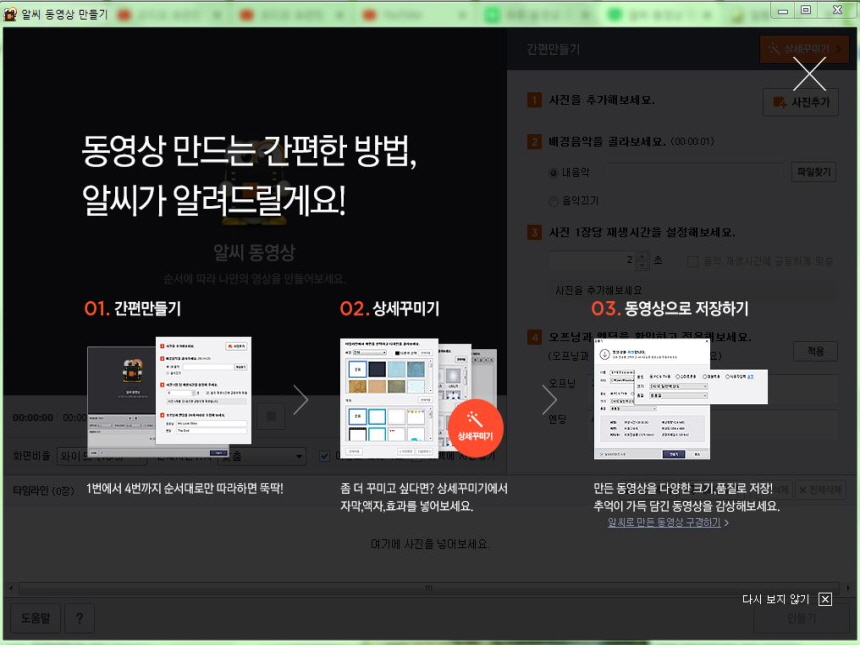 알씨 동영상 만들기 프로그램을 실행하면 처음에 위와 같은 팝업 화면이 나옵니다. 여기서 다시 보지 않기를 눌러줍니다.