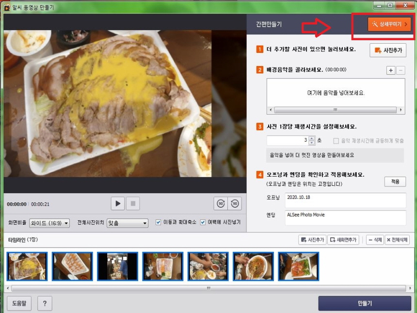 사진 추가를 해주면 밑에 타임라인에 열기한 사진들이 나와있습니다. 사진에 배경음악을 넣을 수도 있고 사진 1장당 재생 시간을 설정할 수도 있습니다. 사진에 자막이랑, 배경이랑, 효과를 넣어줄 수도 있는데 상세꾸미기를 눌러줍니다.