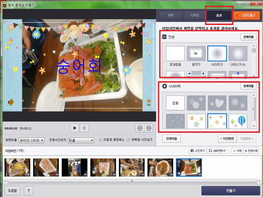 마지막 메뉴인 효과 메뉴로 들어가면 화면이 바뀔 때 어떻게 바뀌는지 선택을 할 수 있고 화면에 나오는 시네마틱 효과에 대해 설정 할 수 있습니다. 여러가지 설정을 완료 하신 후 만들기를 누르면 사진을 합쳐서 동영상을 만들 수 있습니다.