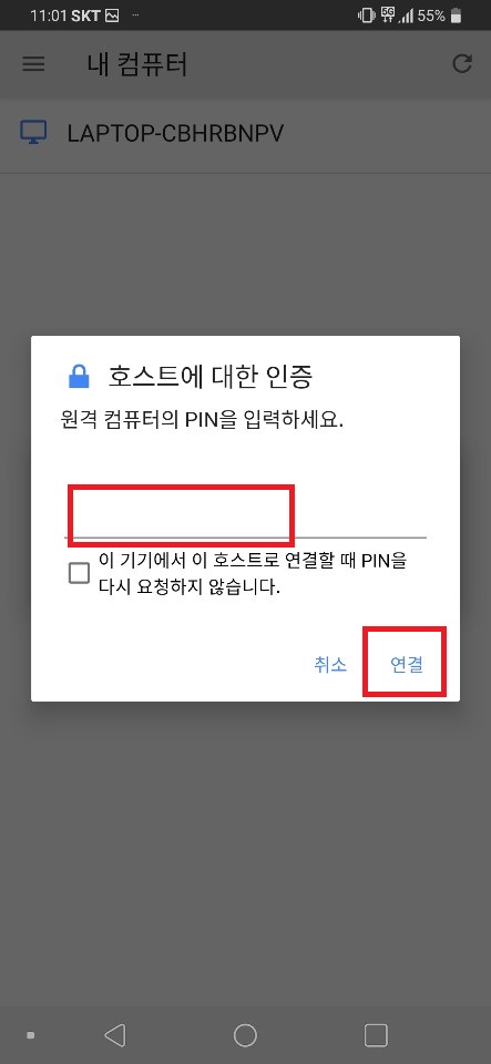 클릭하시면 처음 데스크탑에서 설정했던 핀 번호를 입력하는 화면이 나옵니다. 여기서 핀 번호를 누르고 연결을 눌러줍니다. 아래에 이 기기에서 이 호스트로 연결할 때 PIN을 다시 요청하지 않습니다. 를 누르시면 따로 핀번호를 누르지 않아도 자동 연결이 됩니다.